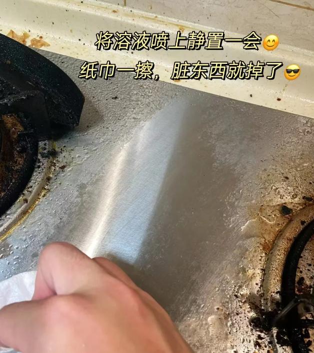往油污上面一喷,静置一会,用纸巾轻轻一擦,脏东西轻轻松松就被擦掉了。