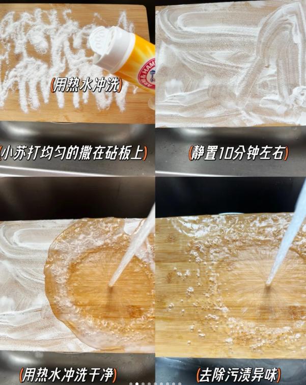 想要清洁砧板,大家别着急,也很简单,把小苏打均匀撒在砧板上面。
