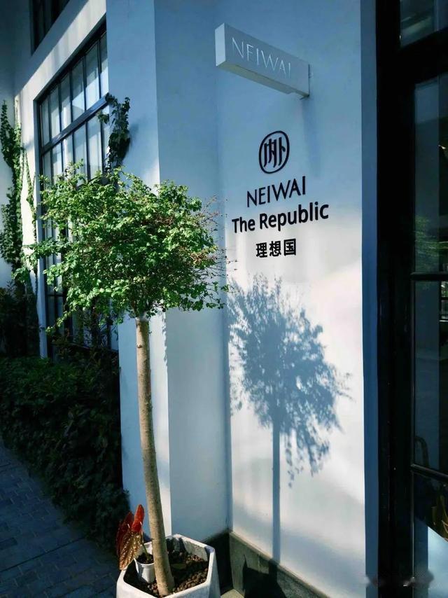 走出办公室,抬头望见墙上的字,“理想国”三个字,和“NEIWAI内外”上下分布着,树影斑驳地投在“理想国”的字下,光影之间,内外自在。