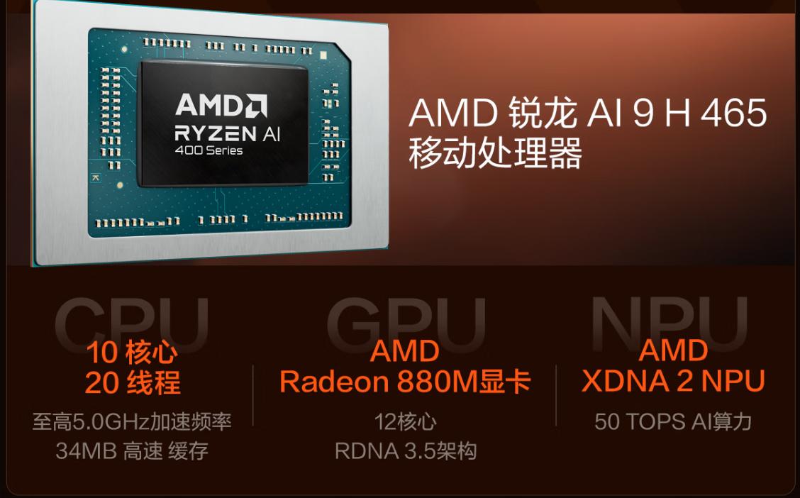 ●搭载新一代AMD锐龙 AI 9 H 465,80W性能释放