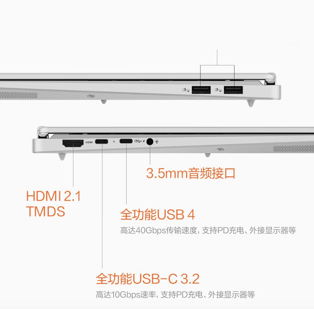 接口与细节配置同样到位,机身两侧配备了一个40Gbps速率的全功能USB4、10Gbps速率的全功能USB-C、双USB-A及HDMI接口,覆盖高速传输、视频输出等需求,外接显示器、移动硬盘、鼠标等外设无需转接器,兼顾实用性与扩展性。此外,该机还具备双麦克风阵列、高清AI摄像头等,能够进一步提升用户在视频会议与在线协作方面的体验。