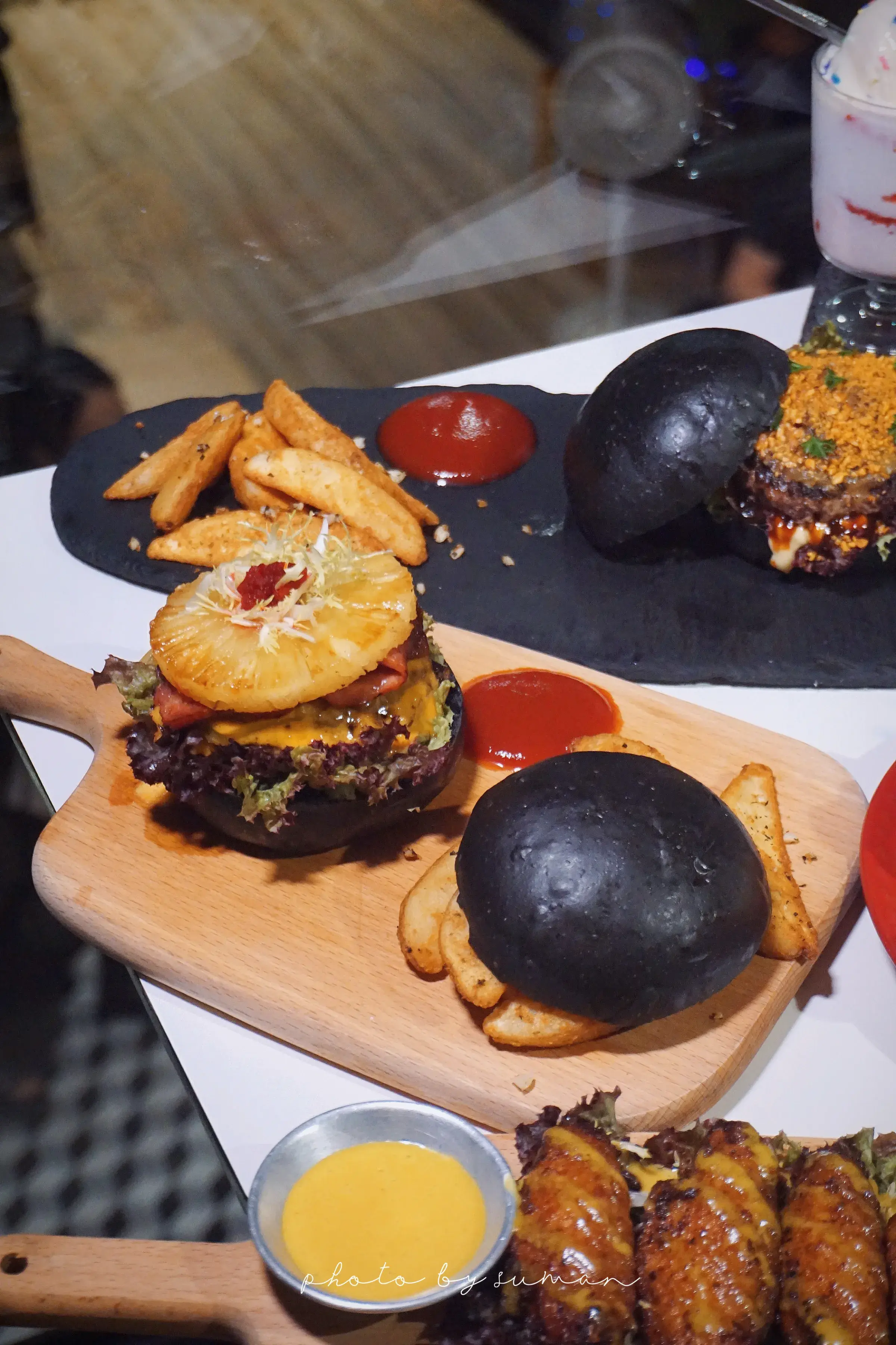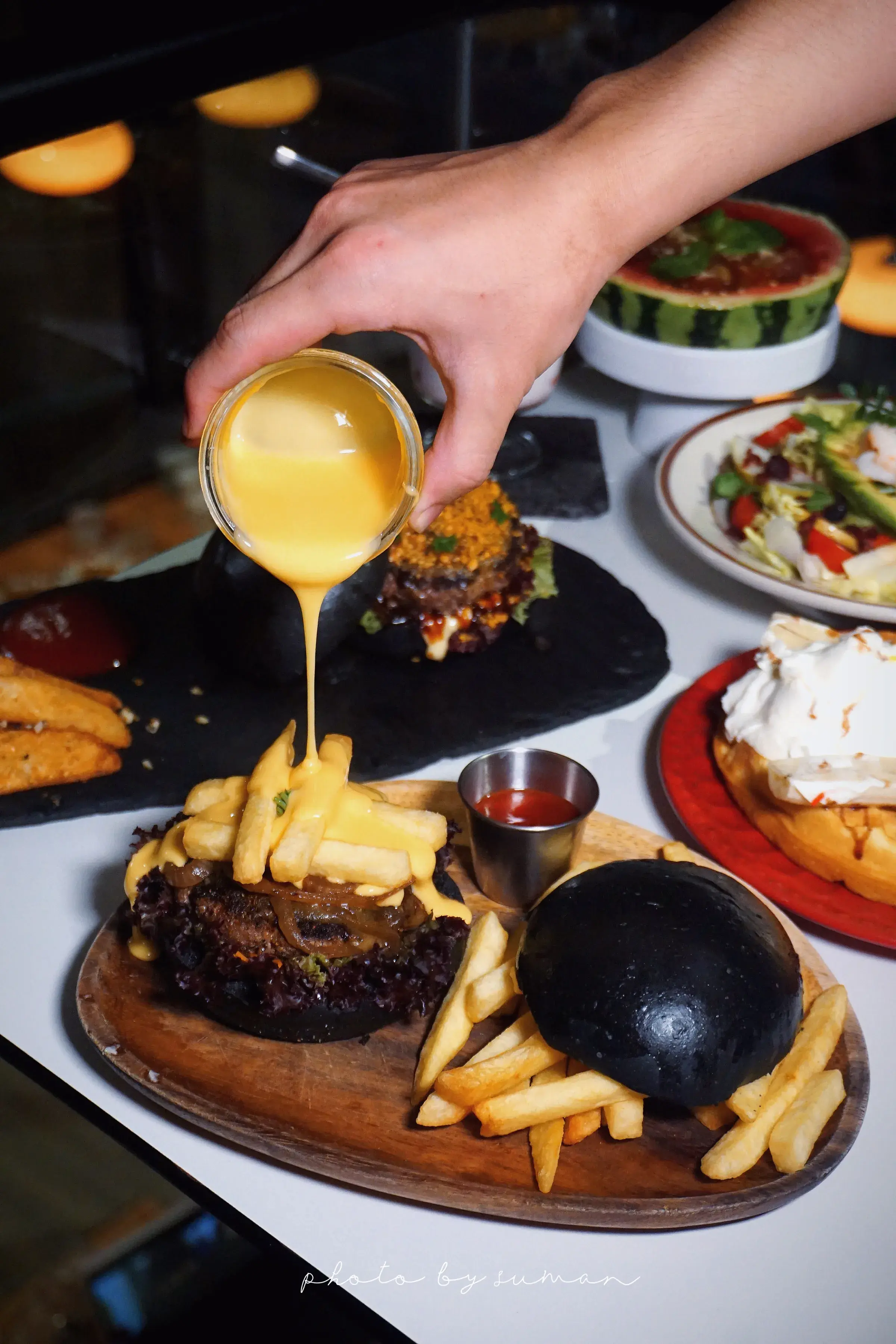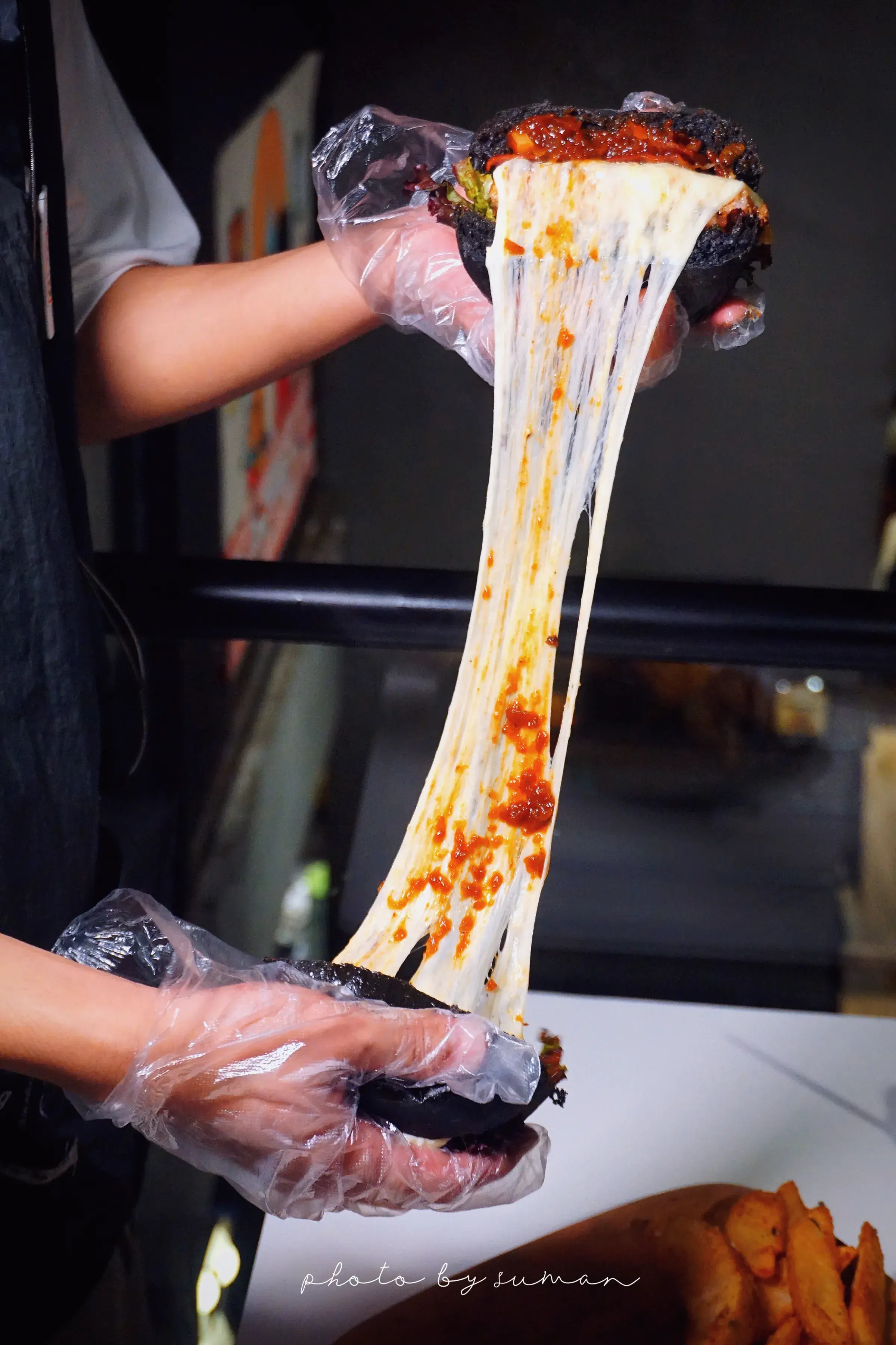 上桌浇给的厚厚芝士,趁热可以拉丝的视觉感。就算不吃牛肉的还有猪肉堡可以满足你!而且配上香浓的芝士,又是让人爱上的味道!