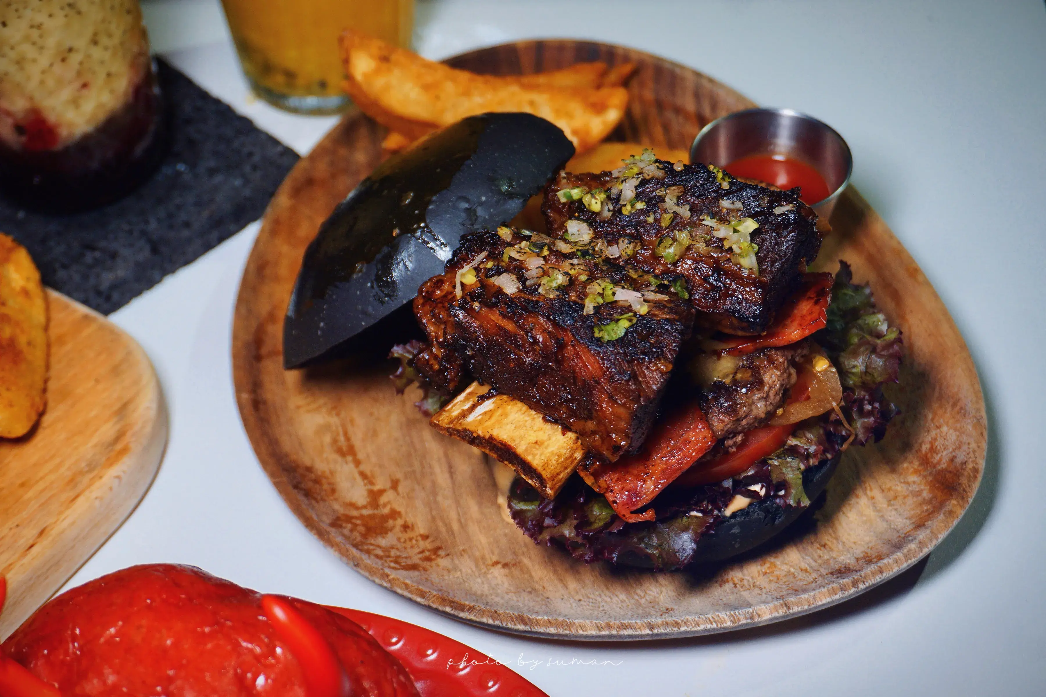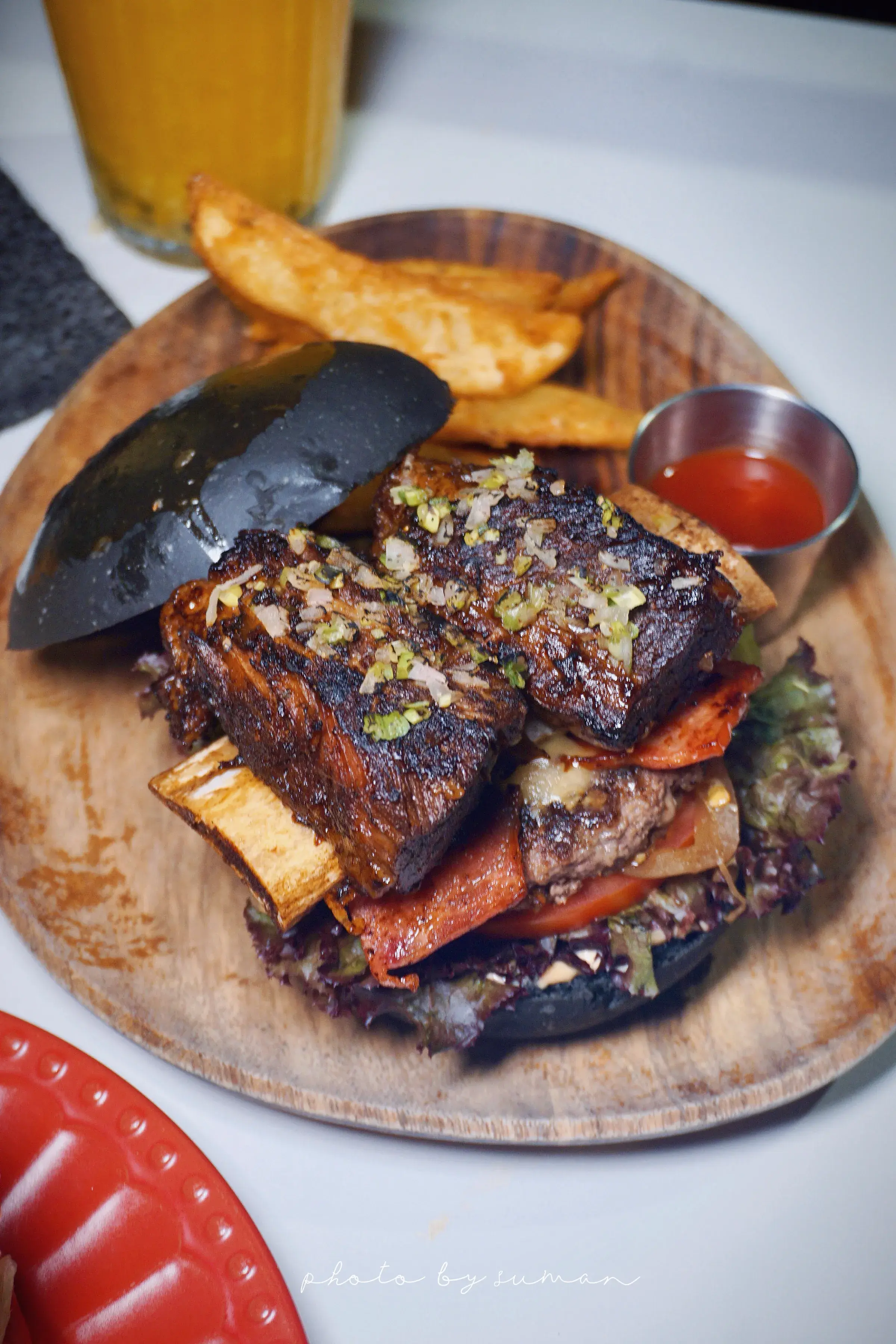 是大块的牛肋排啊啊啊啊!看到这一大块牛肋排,馋人的狠吧!牛肋排烤的恰到好处的入味软烂又脱骨。大口吃肉的过瘾满足啊!而且同样还有厚厚爆汁的牛肉饼,所以点这款就是可以同时吃到大块牛肋排和牛肉饼的汉堡。喜欢吃肉的冲!