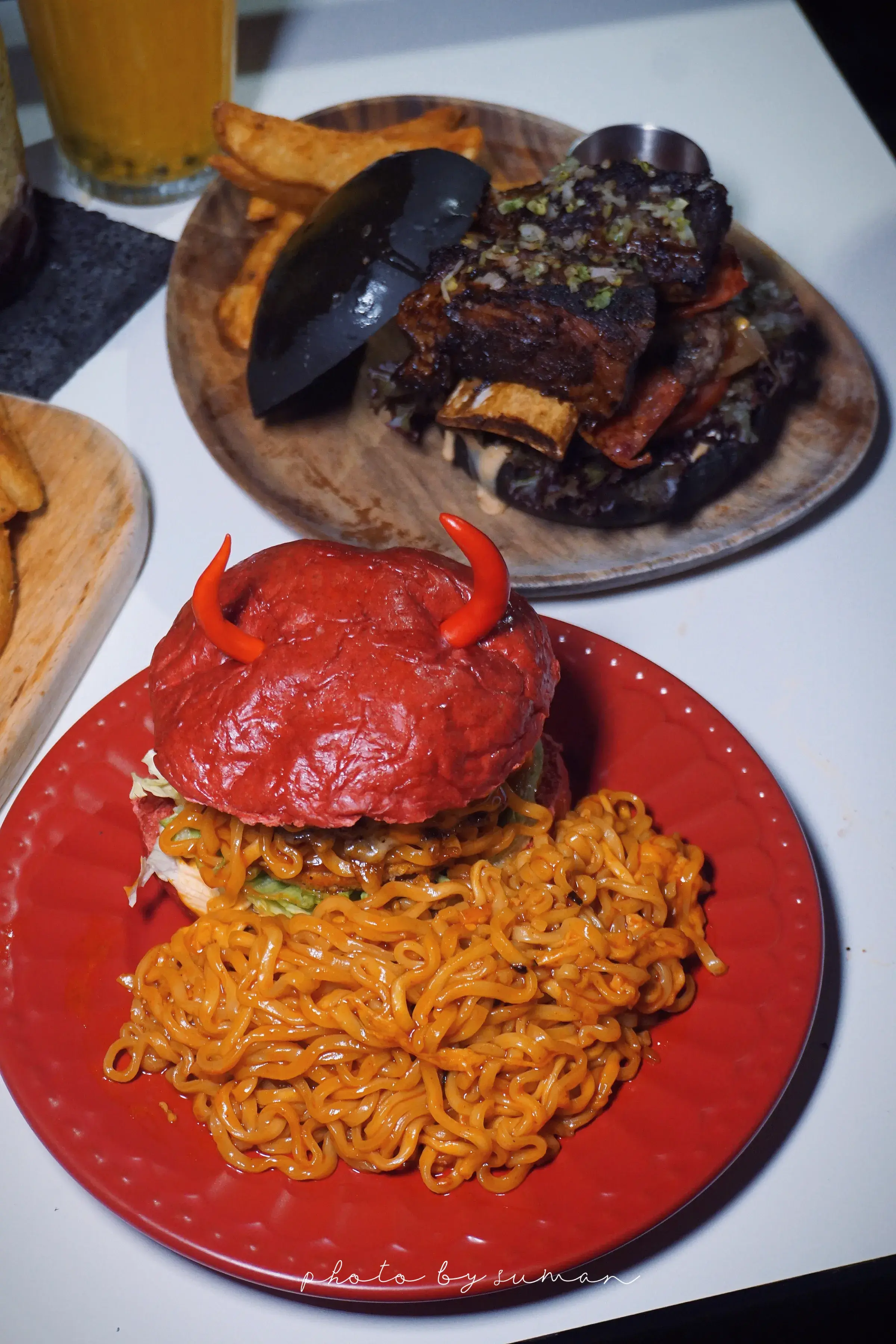能吃辣的,来挑战一下这款辣到惊呼的火鸡面牛肉堡吧,一边斯哈斯哈好辣,一边吃的贼爽!是用三养火鸡面!味道好正!辣味够足!而且做成了火红牛魔王的造型,果然是够火辣~