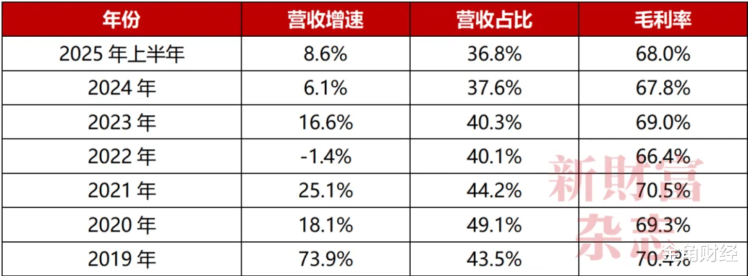 2022年,FILA的业绩便开始失速,这一年的营收同比下滑1.4%、毛利率同比减少4.1个百分点。尽管在2023年,其营收有所反弹、同比增长16.6%,但在2025上半年,营收增速又回落至8.6%,在安踏集团中的营收占比,也从2020年的49.1%下滑至36.8%。