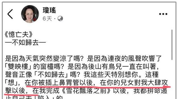 身体状况的恶化更是压垮她的重要原因。琼瑶曾因坐骨神经痛手术,去年更因腰伤不得不停下她钟爱的创作。对一个以笔为生、以笔寄托情感的作家来说,不能创作几乎等于失去了生活的意义。病痛不仅带来身体上的折磨,也吞噬了她的精神支柱。这些年,她所承受的疼痛与失落,可能远超旁人的想象。