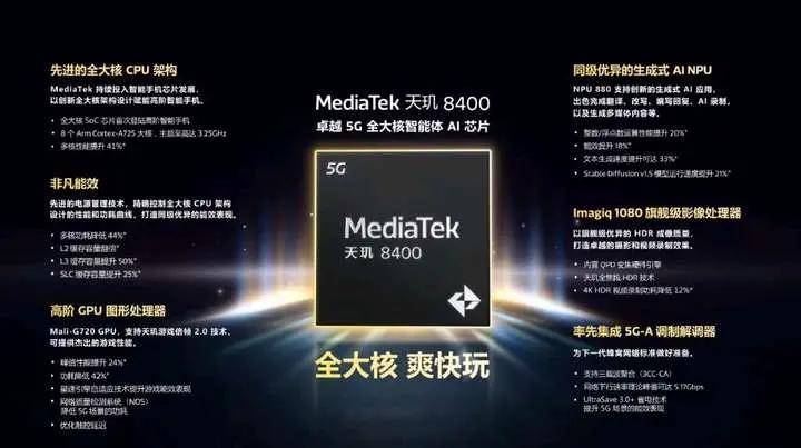 天玑8400是联发科在2024年底推出的一款定位中高端、但性能越级的移动处理器,凭借其独特的“全大核”架构和台积电4nm工艺,在能效与多核性能上表现尤为突出,其在2025年被广泛应用在了中端机型中,算是2025年最具性价比的中端神U。