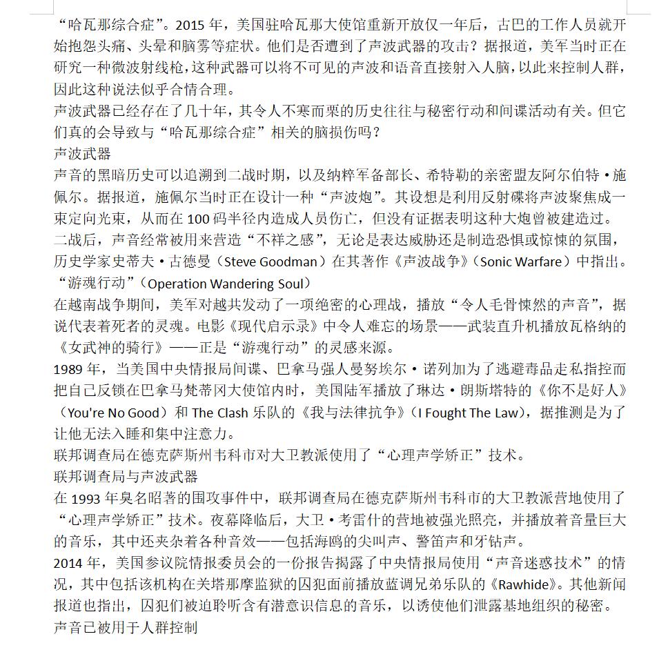 声波武器会在远距离发出巨大的噪音,并可能对范围内的人员造成严重或长期的伤害。据人