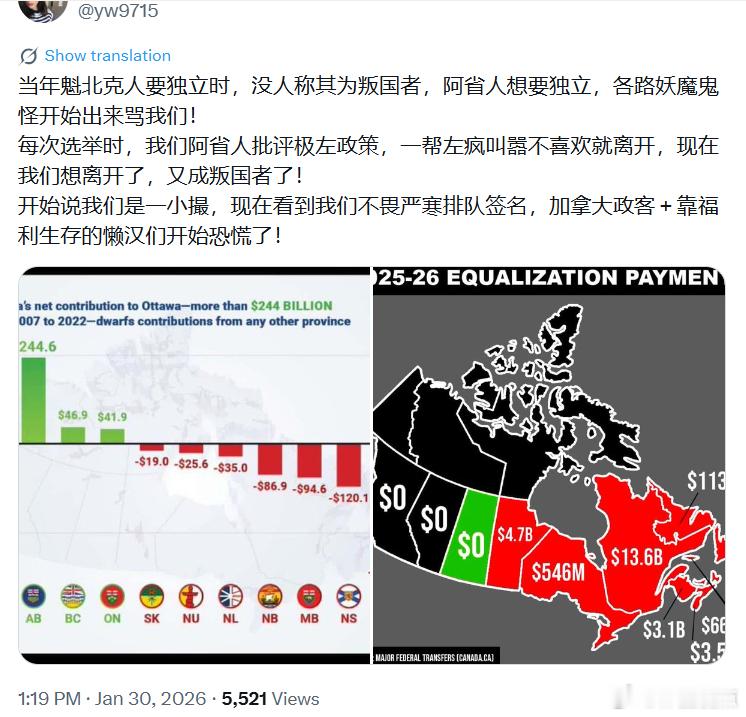 阿尔伯塔省向加拿大联邦净贡献了2446亿加元(税款等支付远超联邦返还),远超其他